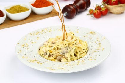 Izgara tavuk,mısır,mantar,fesleğen,permasan peyniri,alfredo sos ile…