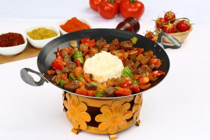 Taze baharatlarla tatlandırılmış dana bonfile,soğan,mix biber,domates ve pilav eşliğinde…