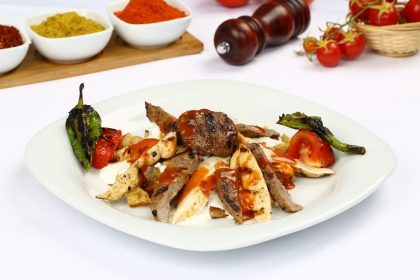 Tere yağında sotelenmiş bazlama ekmeği üzeri yoğurt sos ızgara tavuk dana kül bastı ızgara köfte ve özel domates sos ile…